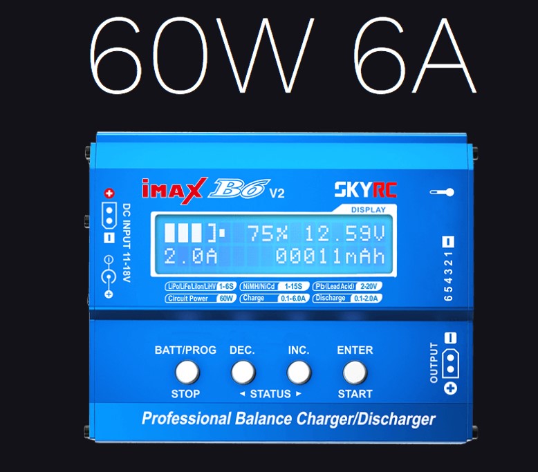 The SKYRC B6 DC V2 is a powerful, microprocessor-based charger / discharger with battery management for use with all major battery types. It has a maximum capacity of  6A charging current at max. 60W and makes it easier for the user to read the LCD display thanks to the new battery icon with percentage display right next to it.
