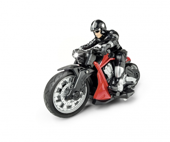 Monte na sua moto! Com a inovadora RC Devil Bike, pode enfrentar qualquer pista de corrida em duas rodas. A Devil Bike promete uma diversão duradoura com um impressionante tempo total de corrida de 50 minutos. As rodas estabilizadoras integradas mantêm a moto sempre na vertical. Isto garante manobras rápidas sem acidentes! O design com suspensão total também garante uma condução confortável e suave. O modelo pronto a conduzir poupa tempo valioso na partida. O fiável comando remoto de 2,4 GHz coloca o controlo total da moto na palma da sua mão. A potente bateria de iões de lítio pode ser carregada convenientemente utilizando o carregador USB fornecido.