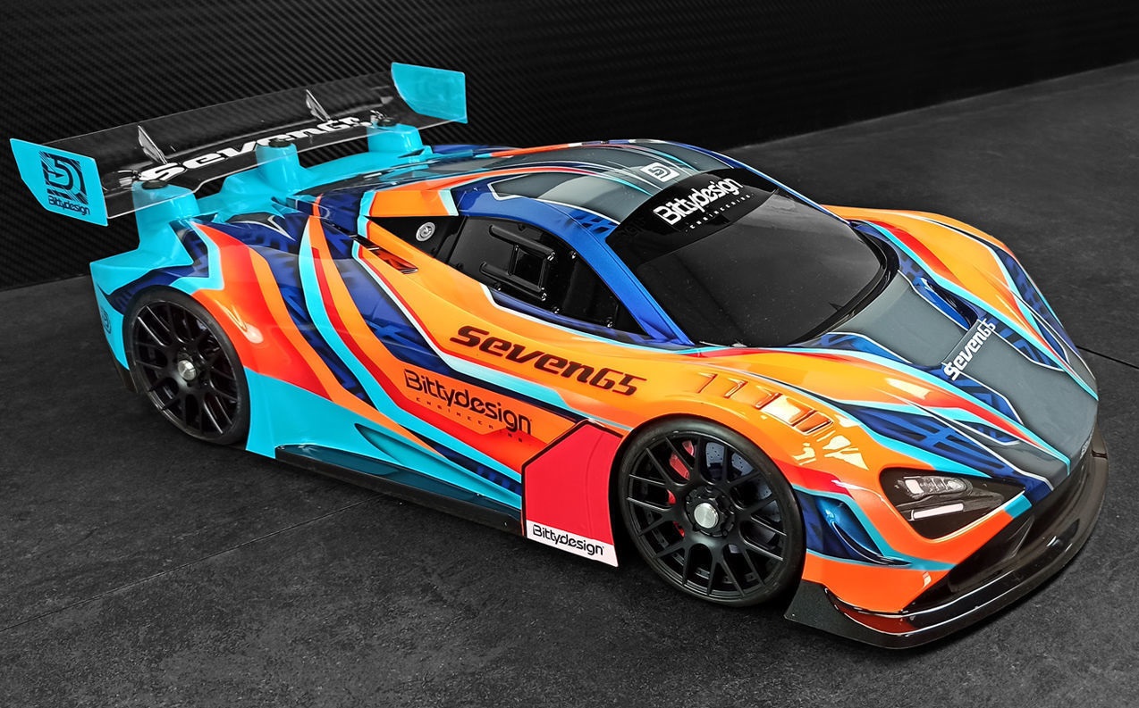 Seven65 is a GT body with a stunning look, the lowered front nose generates an excellent steering while the lowered cab and the amazing shape of the sides stabilize the air flows that conveyed into the large rear wing that make the model easy to drive, the body is well balanced and an improvment of your laptimes is guaranteed.